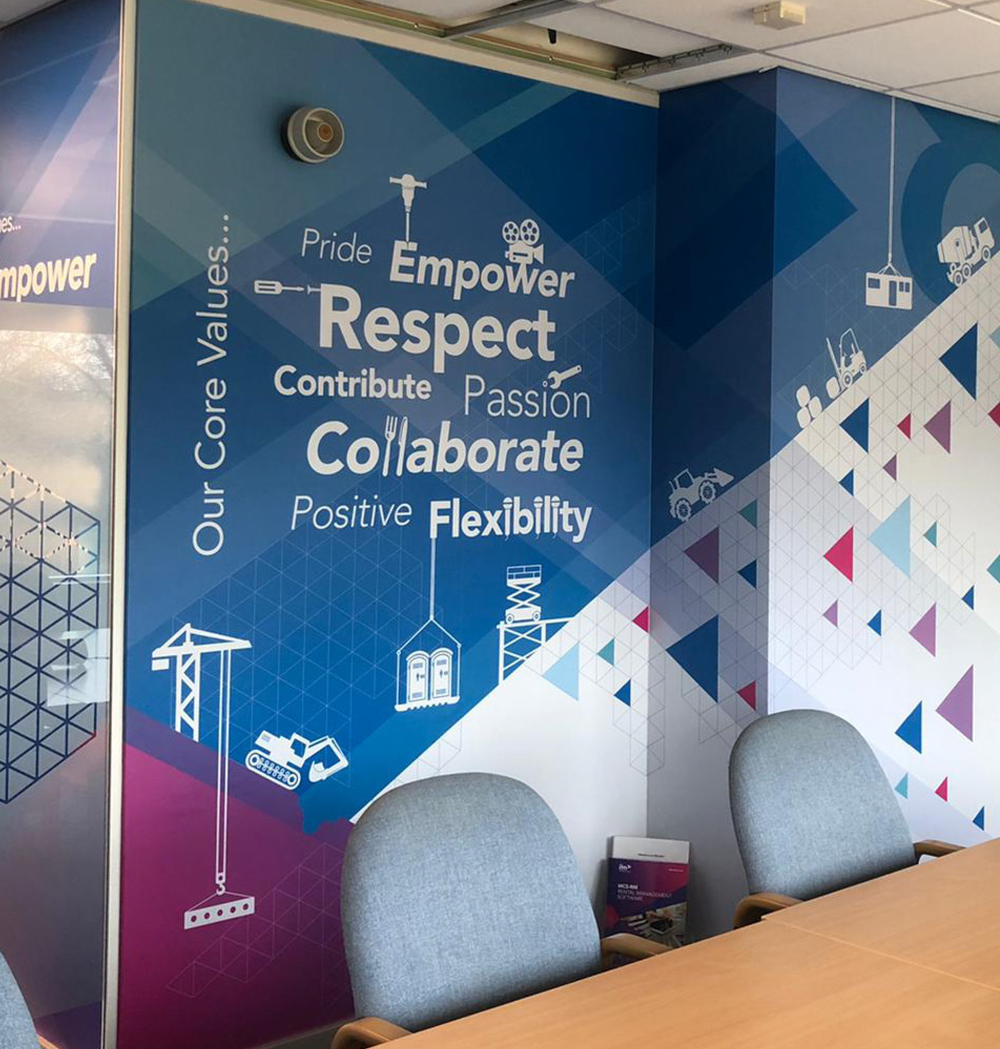 Utilising the new MCS branding, Surefoot delivered large format graphics in the form of wallpapers, vinyl applications to glass, desk fronts and signage throughout the premises. The stunning new graphics concentrated on their brand symbols to deliver carefully thought out graphic solutions. The clever use of transparent and frosted vinyl to allow limited opacity to meeting rooms was continued onto solid wall areas with consistent pattern and colour.
